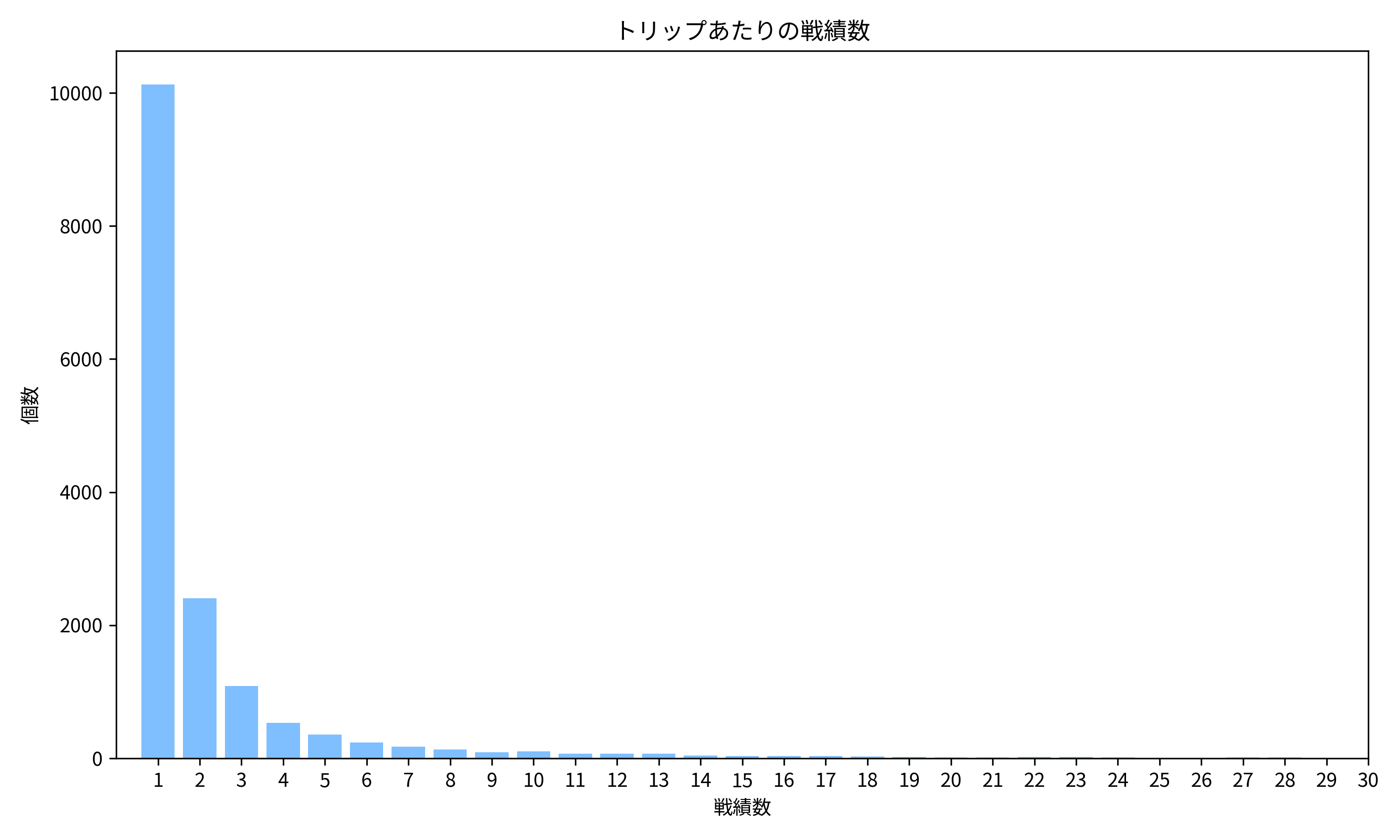 レート1350と1650付近にプレイヤーが偏っています。なぜこのような結果になったのかを調べるため、トリップあたりの戦績数をグラフにしました。